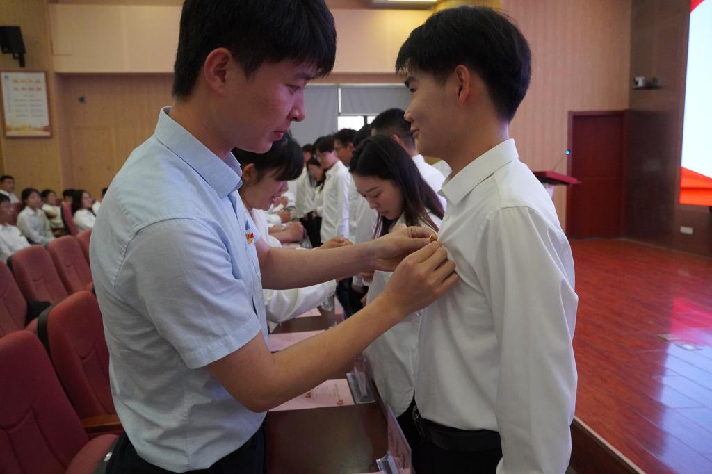 徐伟带领老党员为新党员佩戴党员徽章,并寄予殷殷嘱托。