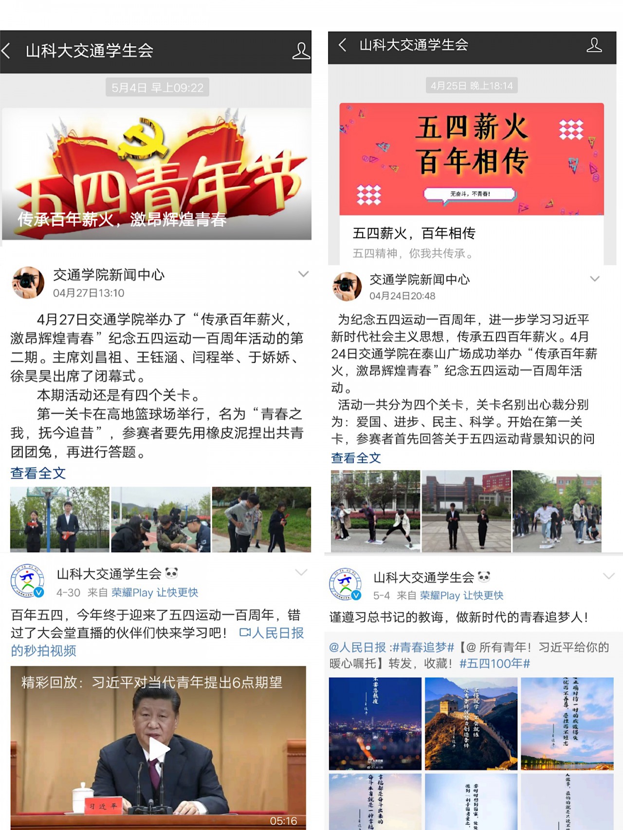 五四风采,青春正好。在活动期间,公司各基层团支部组织举办了形式多样的主题团日活动,效果显著。交通运输2018级团支部组织全体团员青年进行校园漫跑,并开展了设计文化衫活动,在活动中团员青年们感受到自己肩上使命与责任的重大;物流工程2018级团支部组织团员青年到辛安公园进行志愿服务活动,认识到青年人的使命与责任,也体会到团组织的光荣与神圣;交通运输2017-1班团支部举办了“百年光影,五四新语”主题团日活动,分为参观学习和放飞梦想两部分,活动充分展现了团支部成员的精神风貌,校团委副书记秦昌盛、公司团委老师王颖参加本次团日活动并给予了充分肯定。此外,sunbet员工会还开展了“纪念五四运动100周年”趣味竞答活动、“红色三走”趣味运动会、“红色精神,薪火相传”学习分享交流会等形式多样的主题活动。