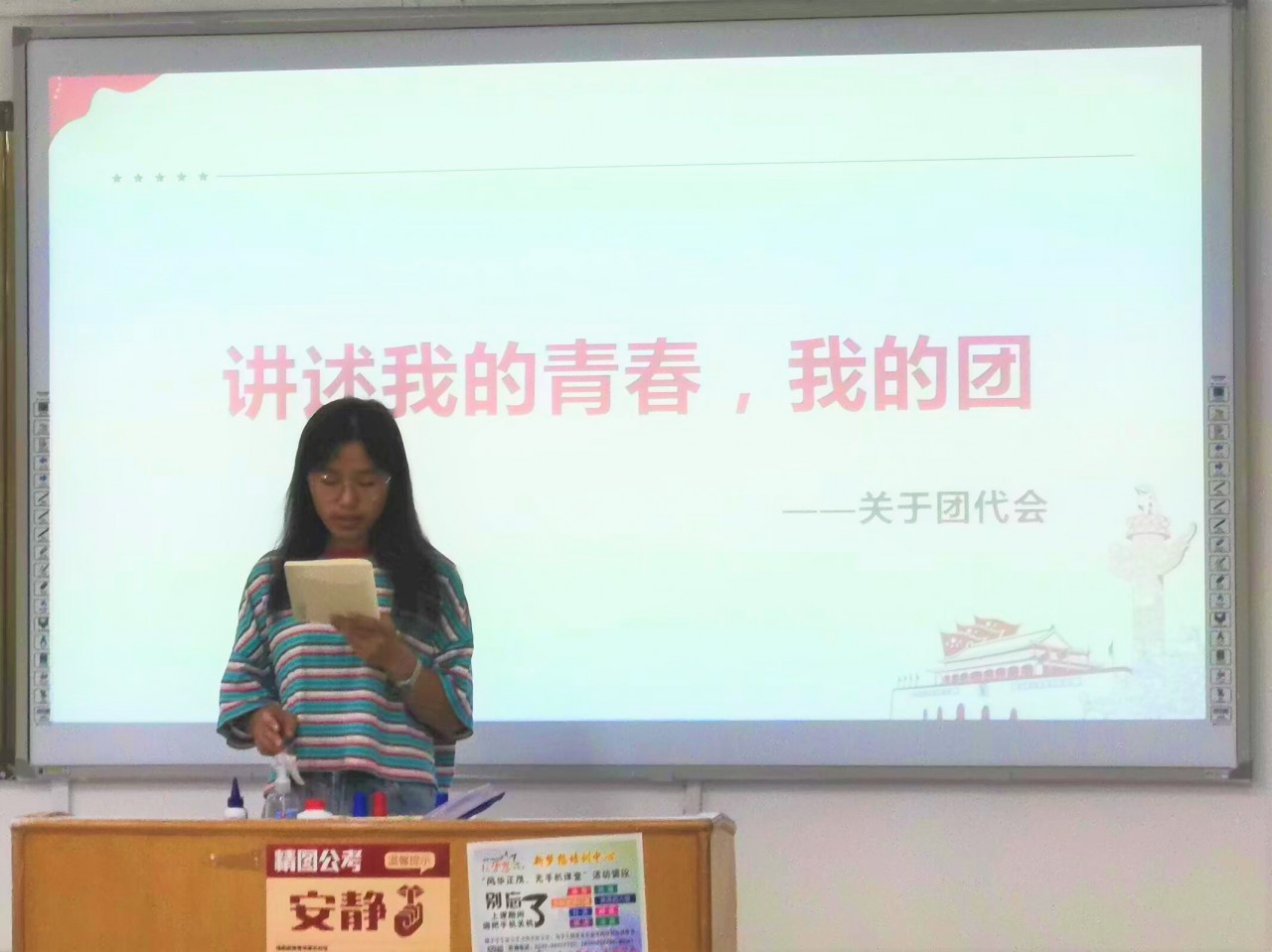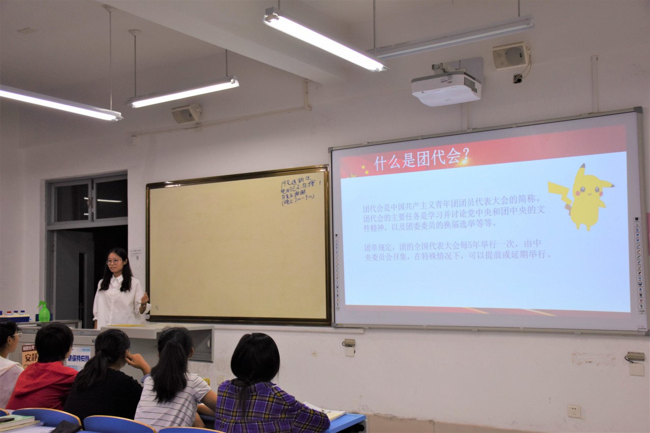 宣讲人高雅宁向新生们讲解了共青团的基础知识,包括共青团的组织原则、团员的权利与义务等内容,带领新生学习了团旗、团徽如何使用等相关知识,并带领新生共同学唱《光荣啊,中国共青团》,为丰富宣讲形式,增强学习效果,与新生展开共青团知识的问答互动,使广大新生对于共青团的政治性、先进性和群众性有了更深入的了解。随后,宣讲人秦媚讲解了团代会的有关内容,就“什么是团代会”、“为什么要召开团代会”、“团代会和我们之间的关系”三方面进行详细解说,鼓励新生们以积极主动的态度关注团代会,用正确的方式看待团代会,以饱满的热情参与团代会,争做新时代的优秀共青团员。