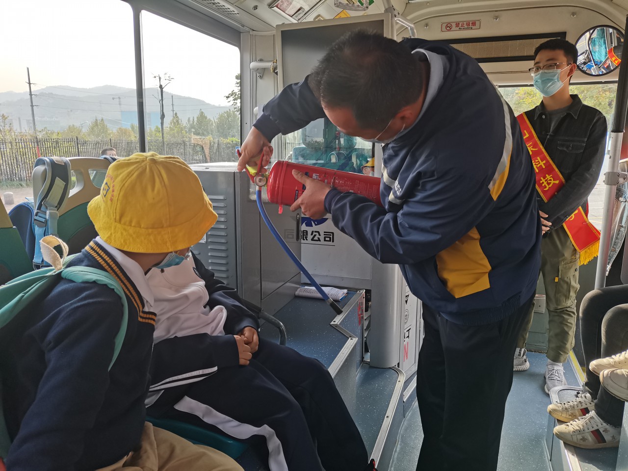 活动伊始,志愿者简要介绍此次活动的流程,主要分为文明乘车、安全乘车、防疫知识宣讲,礼让斑马线活动和前往阜安景苑站点进行安全乘车知识宣传三部分。随后,采取互动的形式向全体员工讲解乘车安全注意事项,提高员工乘车安全警惕性;为加深印象,提高学习效果,带领同学们现场模拟教学,从识别灭火器、正确使用姿势和灭火的最佳位置进行详细介绍;从正确逃生角度向员工们介绍安全锤的作用以及使用方法;结合当前疫情防控处于严峻形势,现场演示讲解乘车时正确佩戴口罩的方法。