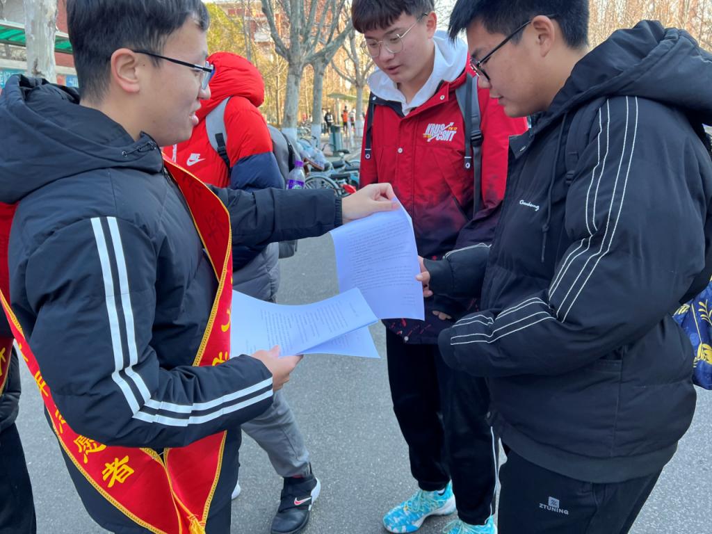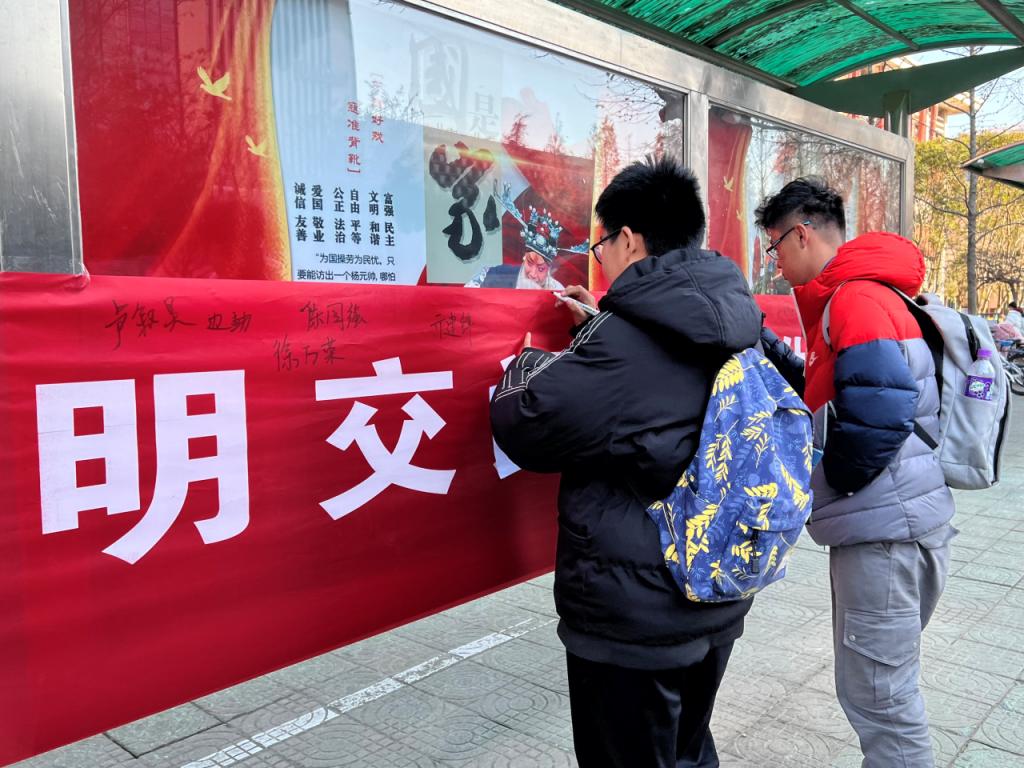 紧接着,结合第十个全国交通安全日“守法规知礼让 安全文明出行”的主题,向同学们提出“树立交通安全意识 养成良好交通习惯”的倡议,制作条幅悬挂在学苑餐厅门口。参与活动的同学自发在条幅上签字承诺,表示将积极响应号召,自觉遵守交通法规,切实维护交通秩序,为营造安全、有序、畅通的文明交通环境贡献自己的力量。