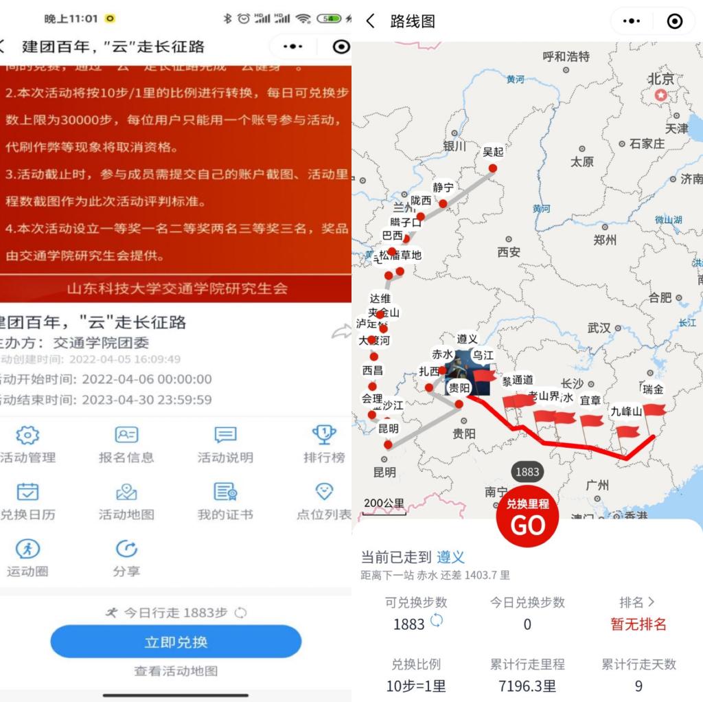 此次活动将红色教育与强身健体融为一体,采用线上比拼形式,以红军长征历史为背景,按照江西瑞金、赤水、金沙江、泸定桥、吴起镇的行军路线,在校园中设置若干个虚拟长征地,同学们每天在生活中的实地步行数据换算到小程序的虚拟长征路线图上,用“步数换里程”的方式模拟行走25000里长征路,完成线上“长征任务”,寄以征程“红飘带”,最后实现“胜利会师”。
