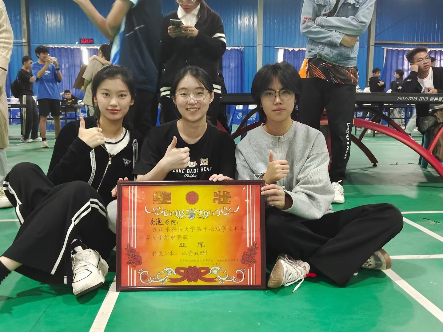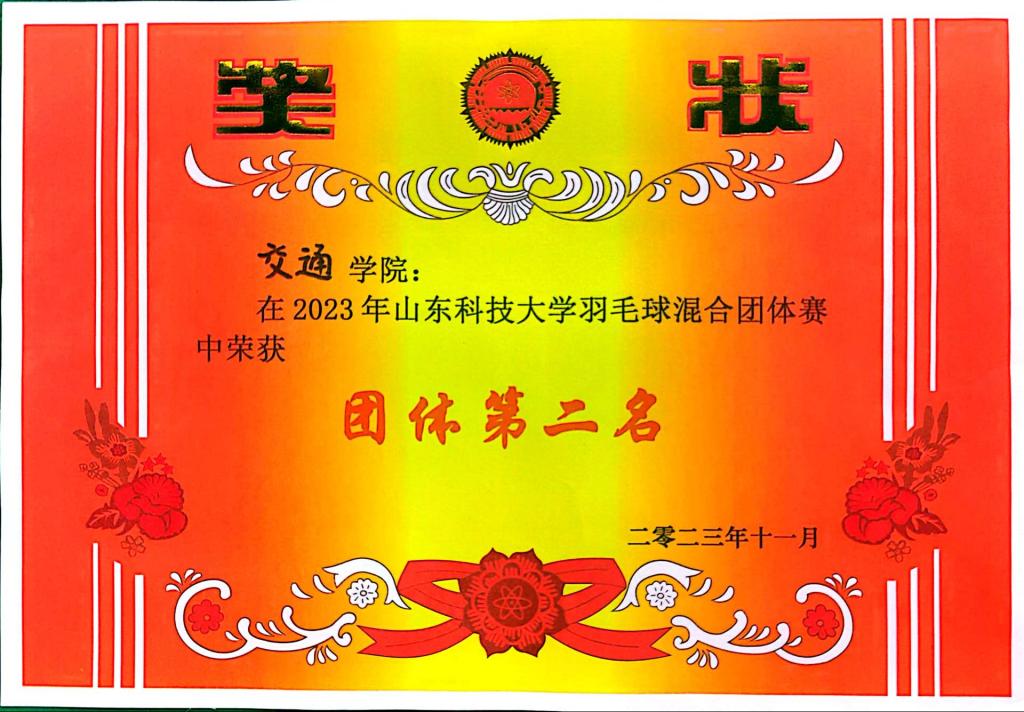 本学期公司各项体育运动再创佳绩,在sunbet官方网站第十七届员工乒乓球比赛中荣获女子团体第二名,sunbet官方网站羽毛球混合团体赛中荣获团体第二名,交通运输2020-3班徐钰晟在2023年山东省老员工田径锦标赛中荣获男子甲组400米冠军,并打破公司记录。下一步,交通学子将继续发扬拼搏精神,在学习工作中再接再厉,争创更加优异的成绩。