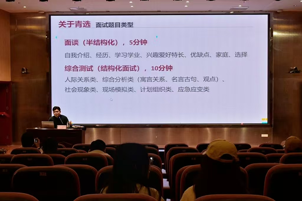 为进一步做好2025届毕业生就业指导工作,帮助毕业生更好地应对公职类考试,近日,sunbet在J9-144报告厅举办第27期禾斗讲堂,由2024年“青选计划”成功入职青岛市市北区的2024届优秀毕业生石浩担任主讲人。