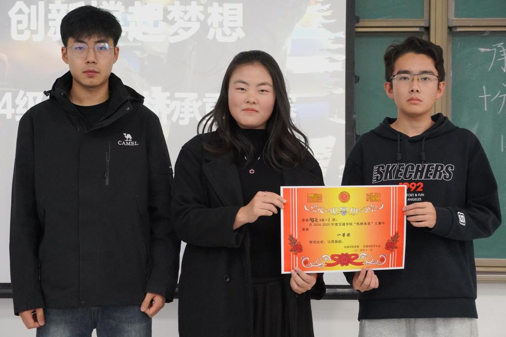 赛前,工作人员详细介绍了比赛规则及注意事项,并邀请了往届比赛的优秀选手进行经验分享。比赛现场,员工们从最初的构思研讨到精心裁剪纸张,结合所学的专业知识,在脑海中勾勒出纸桥的雏形,经过裁剪后,保留最契合承重结构的部分。最终的成型环节,员工们将各部件进行细致的粘贴组装,让每一片纸张紧密相连,共同构筑起纸桥稳固的“筋骨”。期间,小组成员们不时交流讨论,对设计方案进行实时调整优化,力求让纸桥在后续的承重测试中展现出最强实力。承重测试环节,一块块砝码被谨慎地放置于纸桥之上,每增加一份重量,都是对参赛人员知识与实践成果的一次考验。各组精心构思的纸桥承载着不断累加的砝码,一次次突破预期承重量,引发了在场观众的由衷赞叹。最终,智慧交通2024-1班获一等奖,交通运输2024-2班获二等奖,交通运输2024-1班获三等奖。