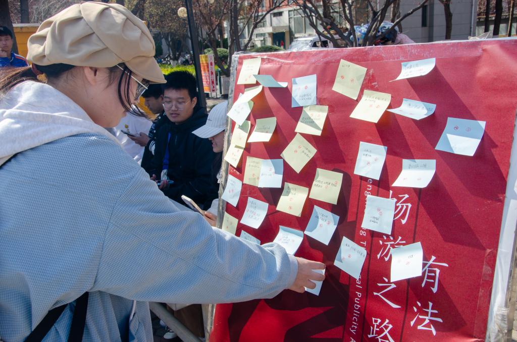 活动伊始,法制小盲盒区域便吸引了众多员工的目光,他们怀着好奇与探索的心情,纷纷上前抽取盲盒,挑战纸条上的法制问题。这些问题涉及校园安全的常识,网络行为的规范以及日常生活中的方方面面。同学们在回答问题的过程中,展现出了对法律知识的浓厚兴趣,通过思考、讨论和互动,深化了对法律条文的理解。“法律条文背背背”环节,同学们需要背诵指定的法律条文。他们或独自记忆,或结伴互助,以饱满的热情投入到这项挑战中。通过背诵法律条文,大家不仅加深了对法律知识的记忆,还进一步感受到了法律的严肃性和权威性。“法制连连看”环节,同学们仔细观察、认真比对,经过一番深思熟虑后,将分别写有实际案例和法律知识的卡片配对完毕,从中锻炼了各自的观察力和判断力,加深了对法律条文与具体行为之间关联性的理解。此外,活动现场还设置了普法常识便签张贴区,在工作人员的引导下,大家纷纷拿起笔,将自己的学习心得、法律感悟或是对法治社会的期待写在便签上并张贴于法制宣传海报。这些便签不仅记录了员工参与活动的点滴收获,也表达了他们对法治精神的认同和追求。