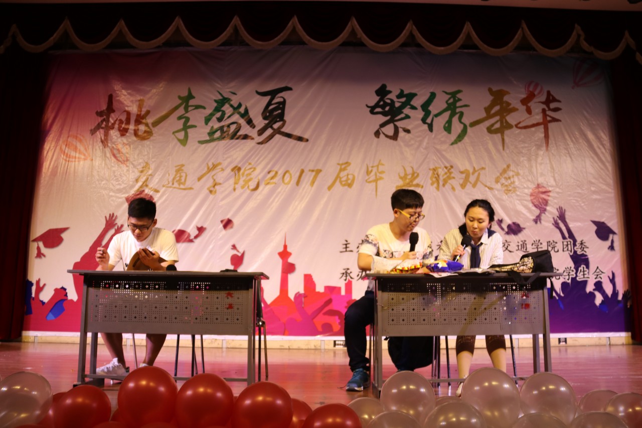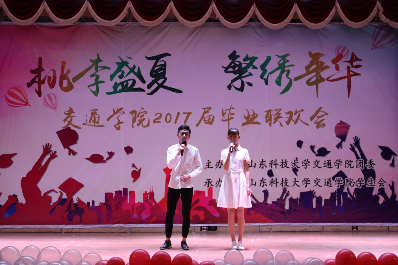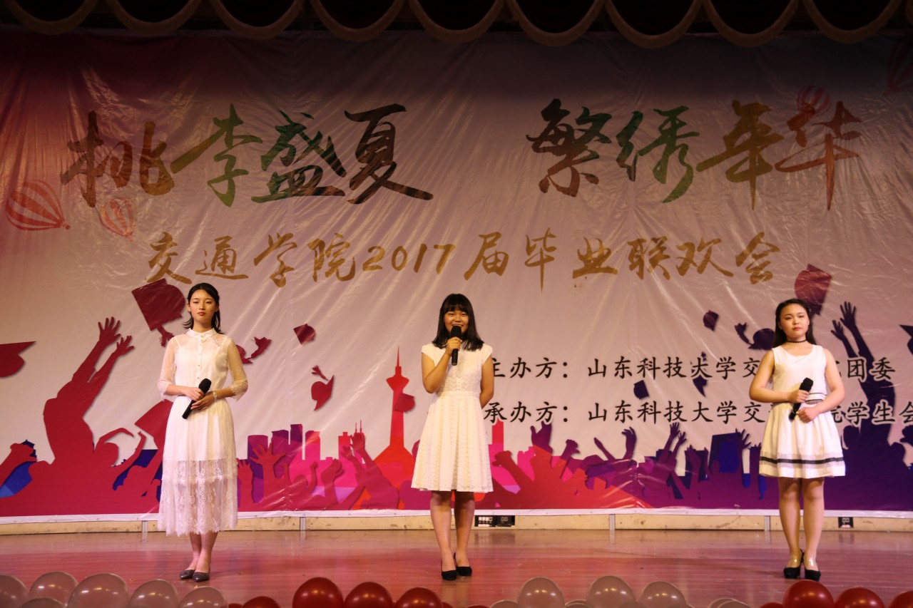 温馨的暖场视频之后,一首动人的歌曲《亲爱的小孩》拉开了联欢会的序幕,歌声柔和悠扬,令在场观众陶醉其中。随后,舞蹈、小品、相声、歌曲、跆拳道等节目轮番上场,精彩绝伦。一截一拳游刃有余,一踢一旋尽显风姿,由毕业生杨建、王成皓带领的气势磅礴的跆拳道表演的高难度击破表演引发台下阵阵欢呼与惊叹;现代舞《why》俏皮可爱、活力满满,古典舞《凉凉》柔美动人、婀娜多姿,交谊舞《舞别》灵秀大方、热情洋溢,更有动感十足的舞蹈串烧,燃爆全场;由毕业生杨瑾纯带来的歌曲《他不爱我》声音细腻,演唱动情之处她几度落泪,亮晶晶的泪珠在她的眼睛里滚动,一颗颗闪闪发亮的泪珠顺着她的脸颊滚下来,滴在舞台上,滴在青春里。相声、小品是近几年毕业晚会上观众最期待的节目之一,小品《白蛇报恩》与双簧《东拼西凑》以其生动明快的语言、丰富夸张的表演,逗得观众捧腹大笑;相声剧《那年你我》诙谐幽默又不乏深情暖语,演绎出大学纯真的爱情和友情,引起毕业生们强烈的情感共鸣,更添别离的深情与不舍。最后,晚会在歌曲联唱《青芒》悠扬温暖的旋律中落下了帷幕。