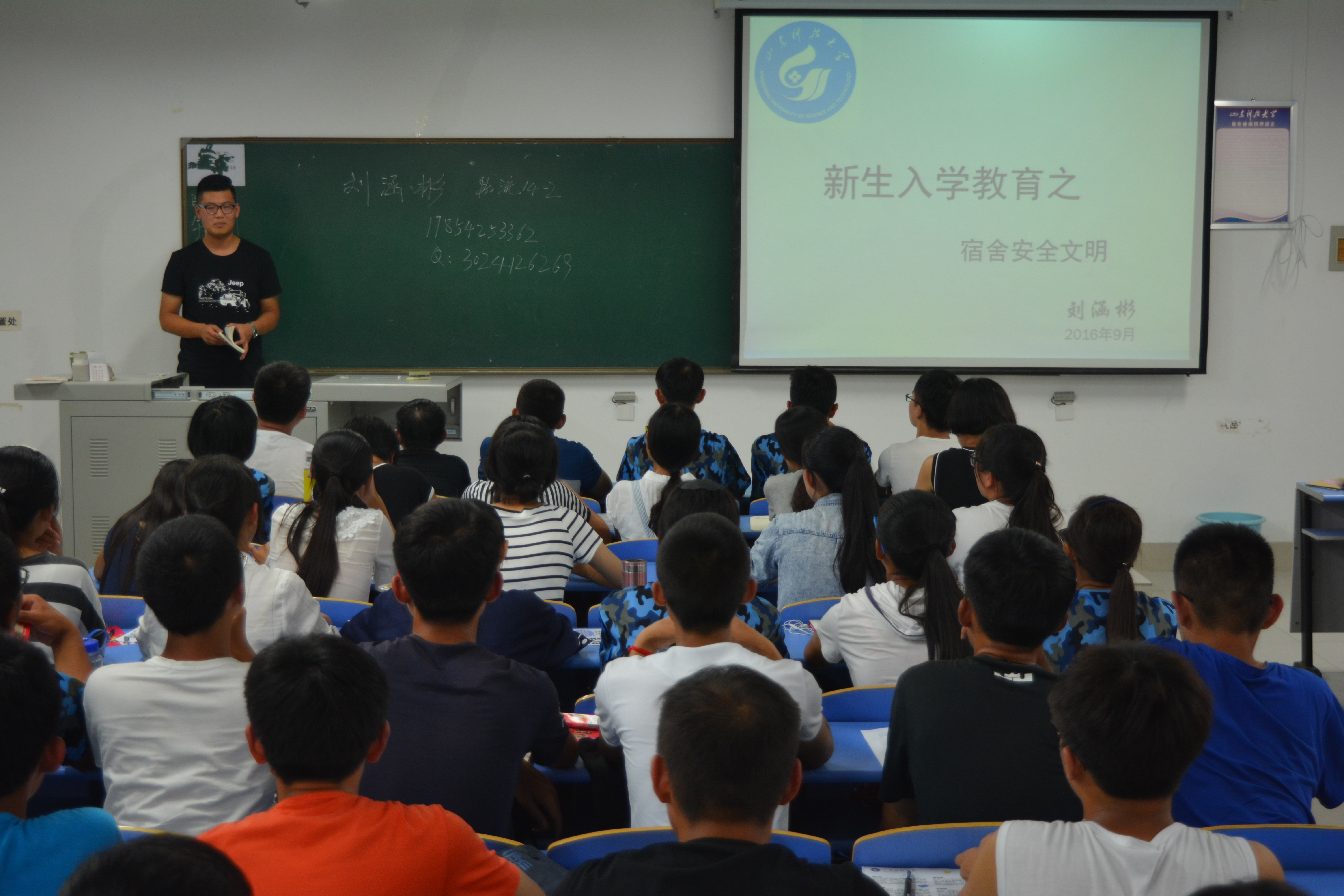 宿舍的卫生和安全与每一位同学的健康、学习息息相关。自律会负责人刘涵彬从宿舍文明、宿舍安全、作息安排、出入刷卡、违禁电器五个方面向新生详细介绍了宿舍文明、宿舍安全和自律会检查细则。