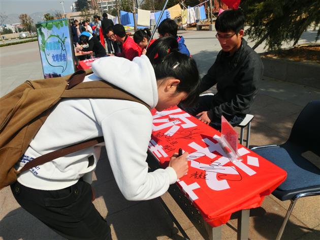 3月22日,由sunbet团委主办、院青年志愿者协会承办的“美丽校园文明你我”签字活动圆满落幕。20余名志愿者走进学雷锋广场,号召全校师生注意言行举止,构筑健康人格,全面提高个人素质。