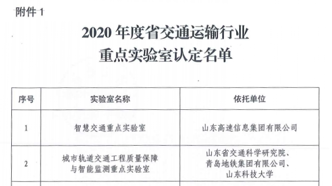 近日,山东省交通运输厅根据交通运输部《交通运输行业重点实验室管理办法》和《交通运输行业研发中心管理办法》等的相关规定,经单位推荐申报、专家评审、现场考核、异议期公示等环节,批准了7家重点实验室和8家研发中心。公司申报的“城市轨道交通工程质量保障与智能监测重点实验室”通过考核并予以公布。