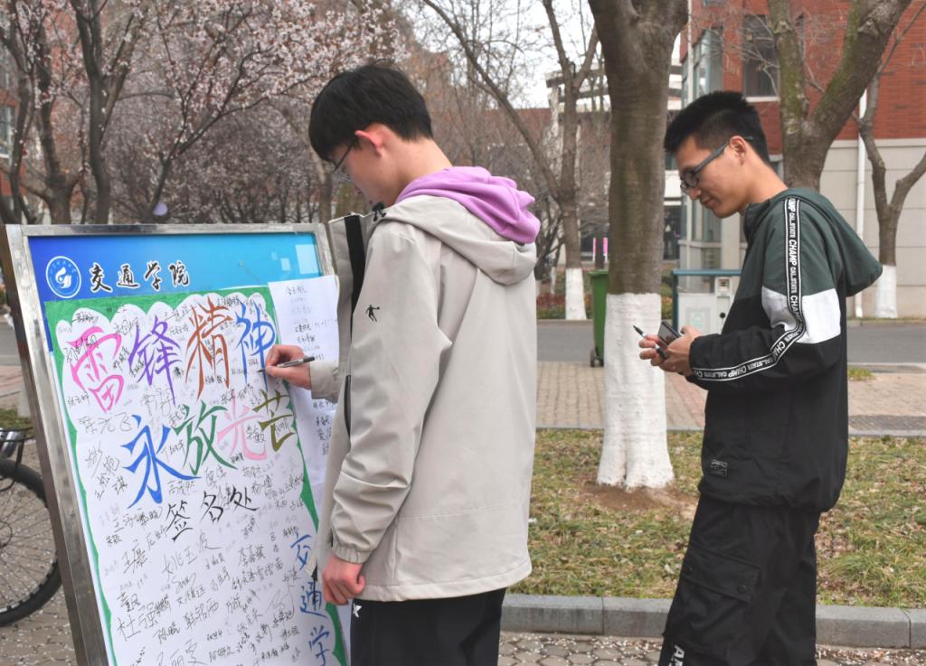 志愿者们在公司砚湖、风雨操场和繁星广场等地发放宣传手册,热情地向同学们宣传着雷锋的故事,并向同学们介绍此次活动目的、形式及意义。活动中,同学们在雷锋精神宣传海报上签名,一笔一画表达着自己对雷锋精神的高度认同和学习雷锋精神的信念。同学们积极接受采访,满腔热情地发表自己对雷锋精神的独特见解。其中,交通工程2020-3班的孙剑钢在采访中说道:“雷锋是我终身学习的榜样,他把有限的生命投入到无限的为人民服务之中,他那闪耀着共产主义思想光辉的崇高精神深深刻在我的心上,我要向雷锋学习!”面对简单的提问,受访者坚定地说出心中的答案,对雷锋精神表达了崇高的敬意。