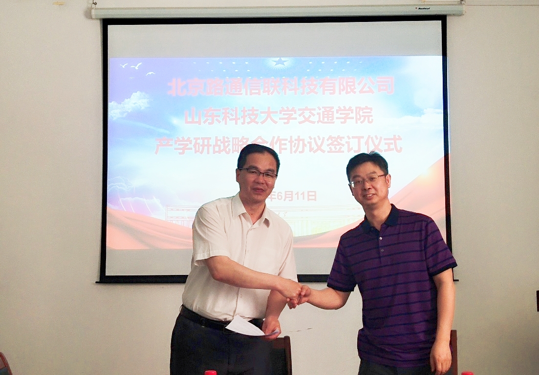 6月11日下午,公司与北京路通信科技有限公司签署产学研战略合作协议,正式建立战略合作伙伴关系。公司党委书记苗汝昌、北京路通信联科技有限公司总经理马道松出席签约仪式,并代表双方签字。公司交通工程系相关教师代表全程参与活动。