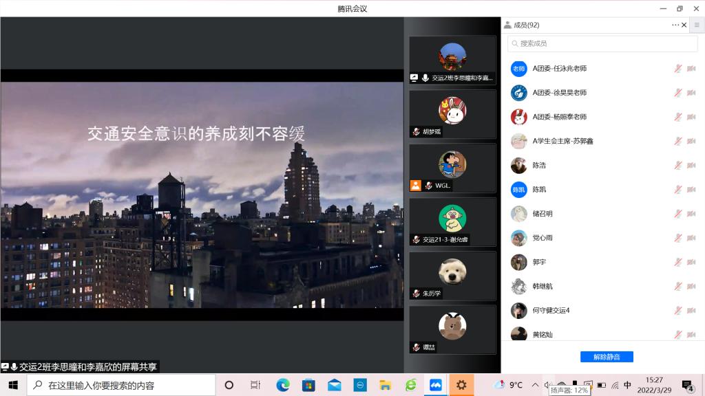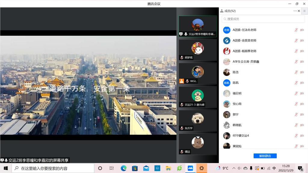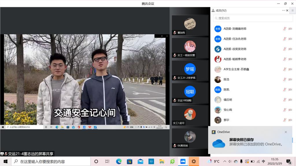 线上答辩环节,交通运输2021-4班作品《交通安全记心间》 通过“模拟电视节目”的方式,研究经典案例,斟酌角色特点,贴近校园生活,以诙谐幽默的语言向观众传递快乐的同时输送交通安全知识,以达到“寓教于乐”的目的,最终斩获本次微视频大赛的一等奖和最佳表演奖。交通运输2021-2班作品《循环》以电影开幕动画切入主题,通过循环得到多个结果将会造成意外的许多原因形象地展现在大家面前,针对常见的交通问题予以纠正,在情节构思、拍摄手法等方面独具匠心。交通工程2021-2班凭借巧妙绝伦的视频剪辑手段,颇具情思地将一帧帧镜头转向城市大交通,以此倡导城市交通安全的重要性。参赛选手们集思广益,以多变的表现手法引导大家严格遵守交通规则,观看比赛的同学们纷纷表示,作为青年老员工将努力践行社会主义核心价值观,文明出行,安全出行。