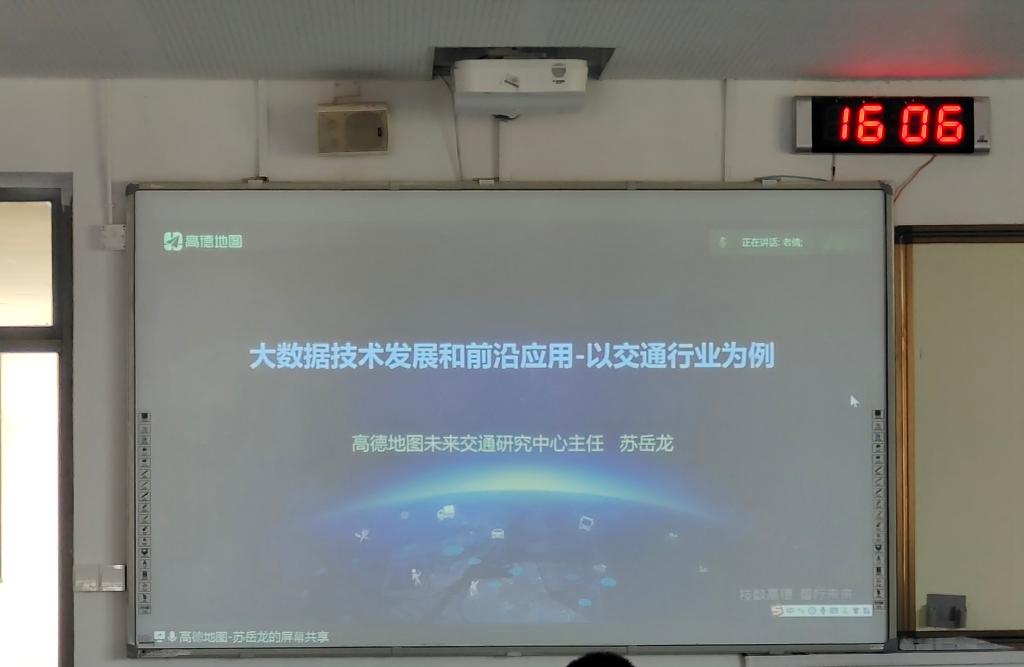 苏岳龙指出,目前交通大数据应用过程中的痛点问题为“交通数据不掌握”“模型算法不理解”“分析结果难验证”。针对痛点问题,他结合行业经验从“互联网+”视角详细介绍了基于导航软件和位置服务的交通数据的获取、挖掘、分析和应用,诠释了如何将数据准确无误的转换为信息后还能精确的传递给受众并做出正确决策。另外,他还向同学们介绍了高德地图导航系统通过大数据来掌握人地和时空,精确快速地导航到目的地的相关内容,为大家详细阐述大数据给行业带来的新发展和新应用。