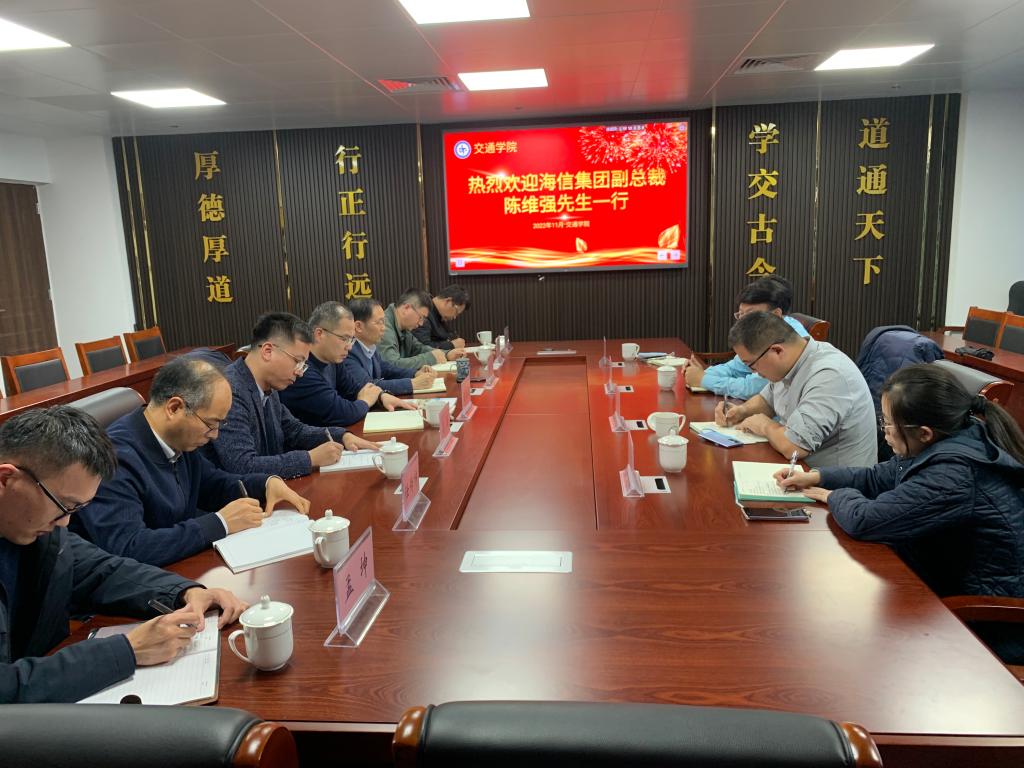 11月22日,海信集团有限公司高级副总裁陈维强、海信网络科技公司总工程师孙永良等一行4人来公司就科研及实验室建设等事宜进行合作交流。公司党委书记苗汝昌、经理辛嵩、经理助理苏会锋、高歌及交通工程系主任管德永等参加了座谈交流。