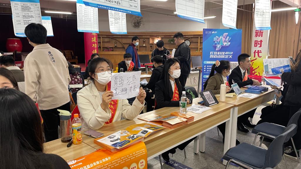 招聘会现场人头攒动,气氛十分热烈。每个招聘单位一对一配备就业服务大使,统一着装,佩戴绶带,代表招聘单位向求职的员工们介绍薪资待遇、招聘计划等。秉持认真负责的态度,各位就业服务大使各出奇招,有的提前准备笔记本电脑或者平板电脑循环播放企业宣传短片,有的通过分发印有企业logo的本子、U盘等礼物吸引求职员工,有的则在展位摆放了可爱的玩偶营造轻松的求职氛围,有的考虑到同学们看到公司名称误以为单位太远会降低求职意向,便自制手写牌做进一步解释,咨询毕业生人数显著增加……热情周到的服务得到了师生、用人单位的一致好评。
