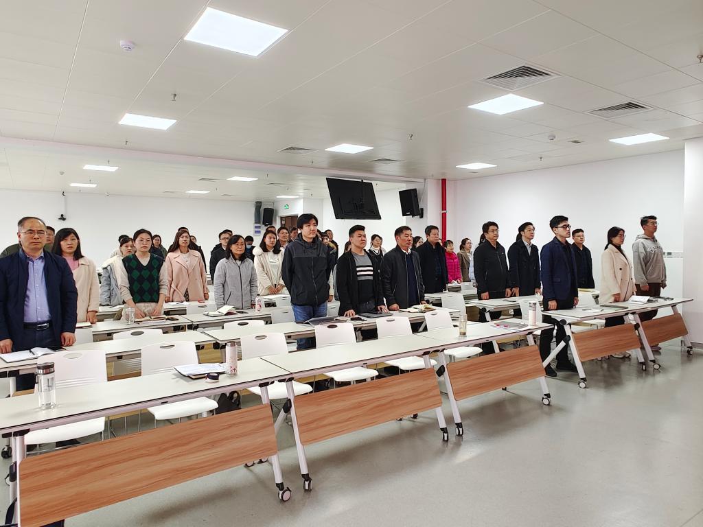 会议在庄严的国歌声中拉开帷幕,全体教职工奏唱国歌。