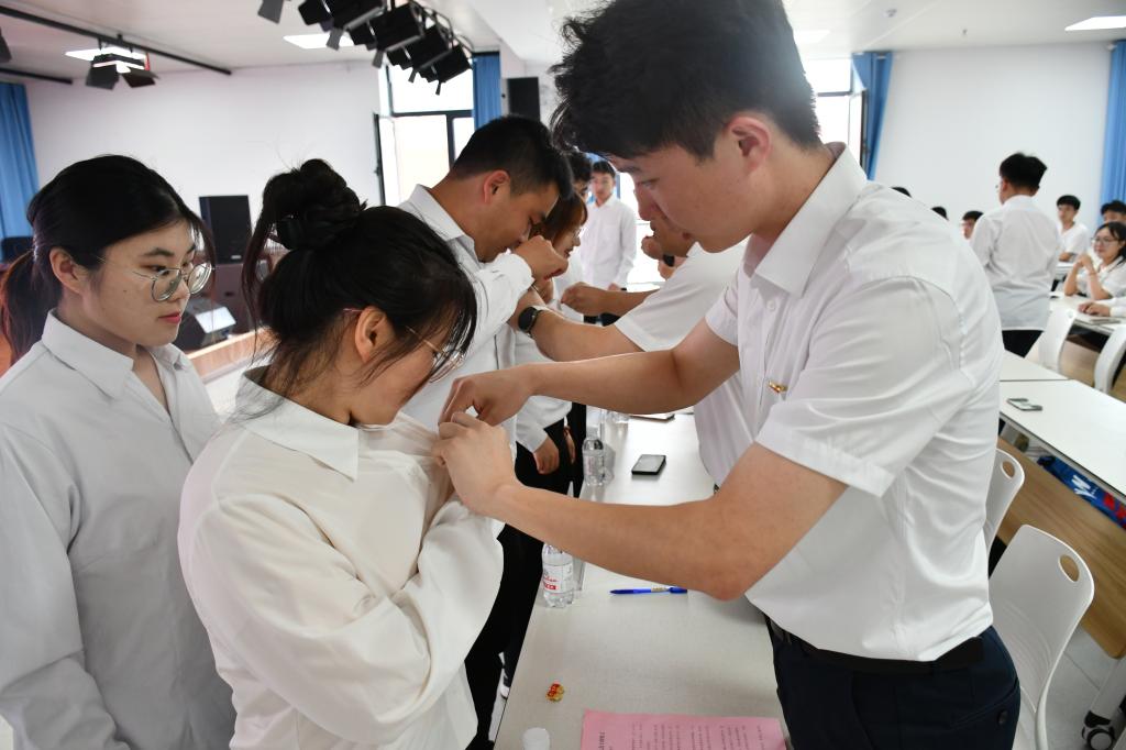 苗汝昌带领老党员为新党员佩戴党员徽章,并寄予殷殷嘱托。全体党员紧握右拳,在鲜红的党旗下铿锵有力地宣读入党誓词。