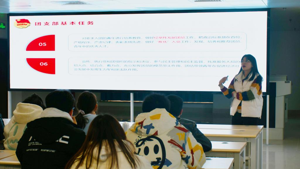 刘倩婧以《走进共青团》为主题,围绕“共青团的历史与传统”“共青团的改革与创新”“全面把握从严治团”“做好新时代共青团工作”四个方面,向同学们介绍了共青团的基础知识与光荣传统,强调了全面从严治团对共青团改革的重要意义,使同学们对共青团有了更深刻的认识,进一步明确了团支委的使命担当,为贯彻学习党的二十大和团的十九大精神,做好新时代高校共青团工作明确了发展方向与奋斗目标。