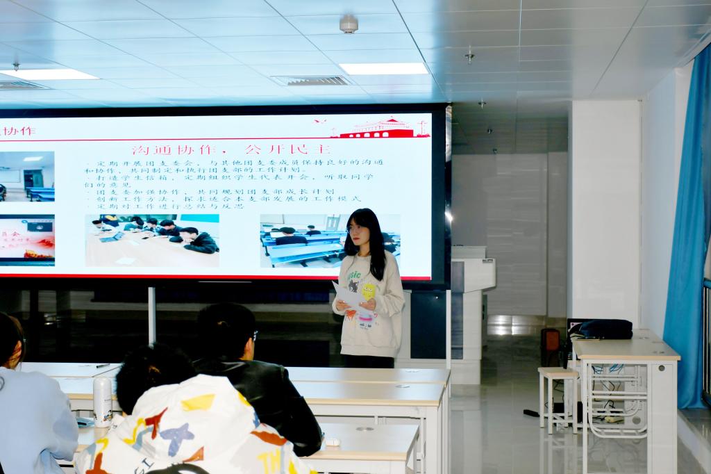 高雅宁以“如何做好团支部工作”为主题,详细介绍了团支部工作原则与基本任务、团支部组织建设、如何做好团支部工作三个方面的内容,并希望各位团学干部要努力将各团支部建设成一支“筑牢信仰、以党为根,砥志研思、以学为先”的先进团支部;赵一帆从自身的经历中总结经验,从如何做好团支部工作、如何发挥好带头作用两个方面展开分享,她强调,只有作风优良,态度认真,工作踏实,能够担当,责任心强,才能起到模范带头作用,领导团内成员开展各项工作,将团支部建设成为一支思想先进、凝聚力强的先进团支部。最后,她与各团学干部分享了自己总结的十点工作方法,希望大家有所启发。